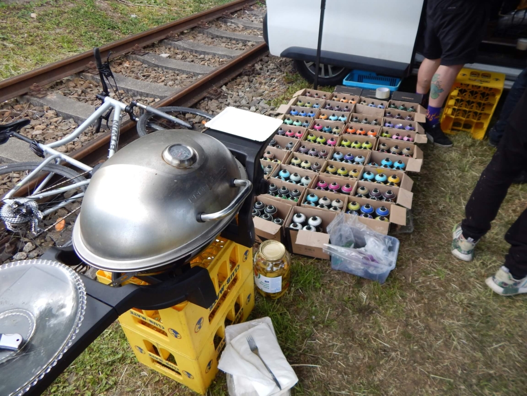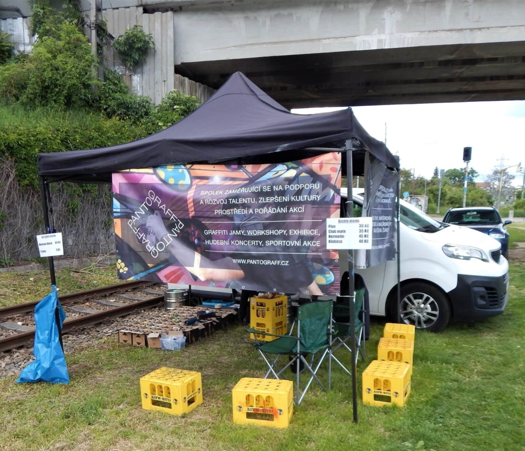 Na místě jako vždy mobilní Pantograff art store stánek s prodejem barev, gril a točené pivo, nebo Club maté.